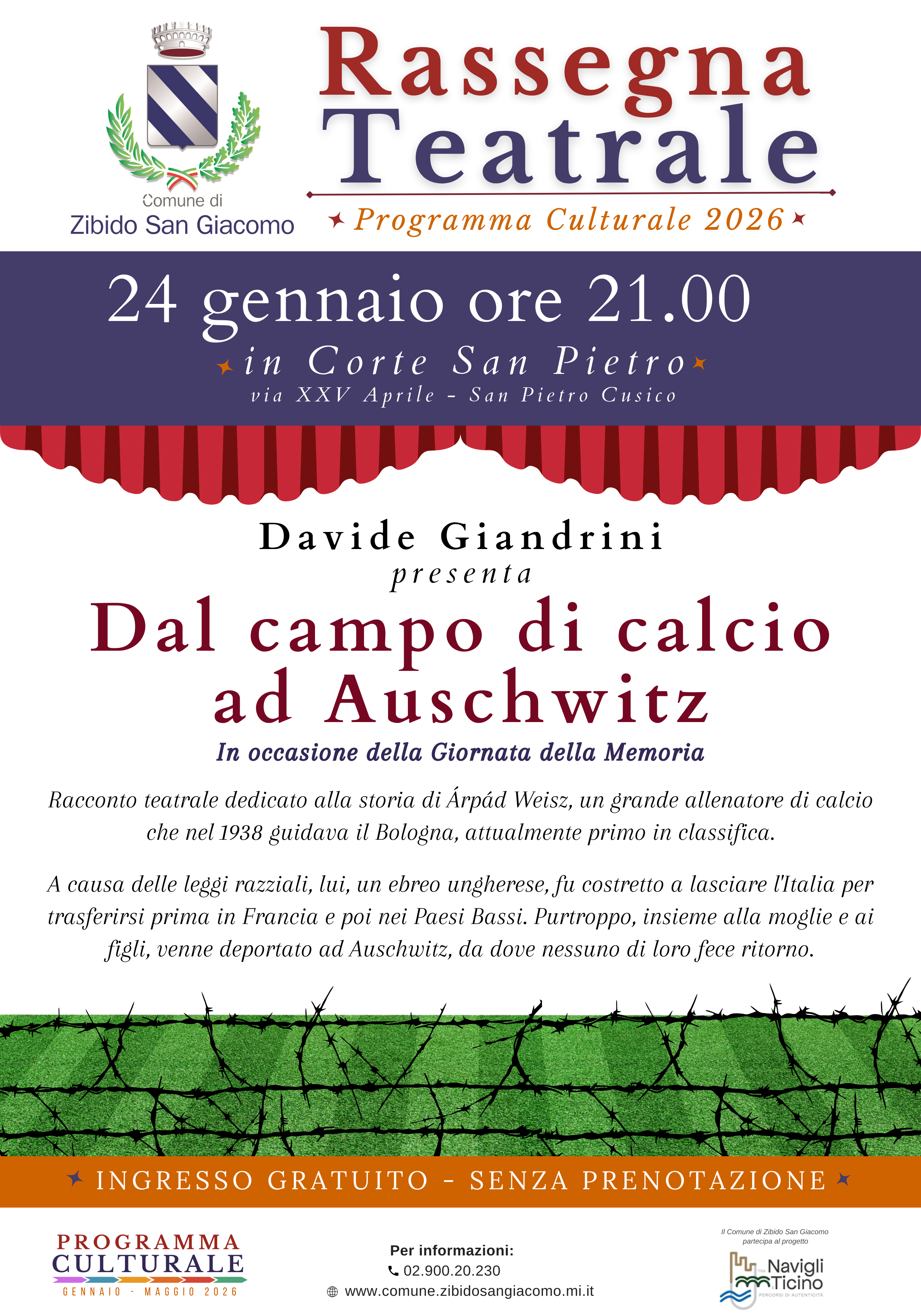 In occasione della Giornata della memoria, a partire dalle ore 21.00 in Corte San Pietro, andrà in scena il racconto teatrale "Dal campo di calcio ad Auschwitz" presentato da Davide Giandrini. La storia di Árpád Weisz, un grande allenatore di calcio che nel 1938 guidava il Bologna che, a causa delle leggi razziali, lui, un ebreo ungherese, fu costretto a lasciare l'Italia per trasferirsi prima in Francia e poi nei Paesi Bassi.